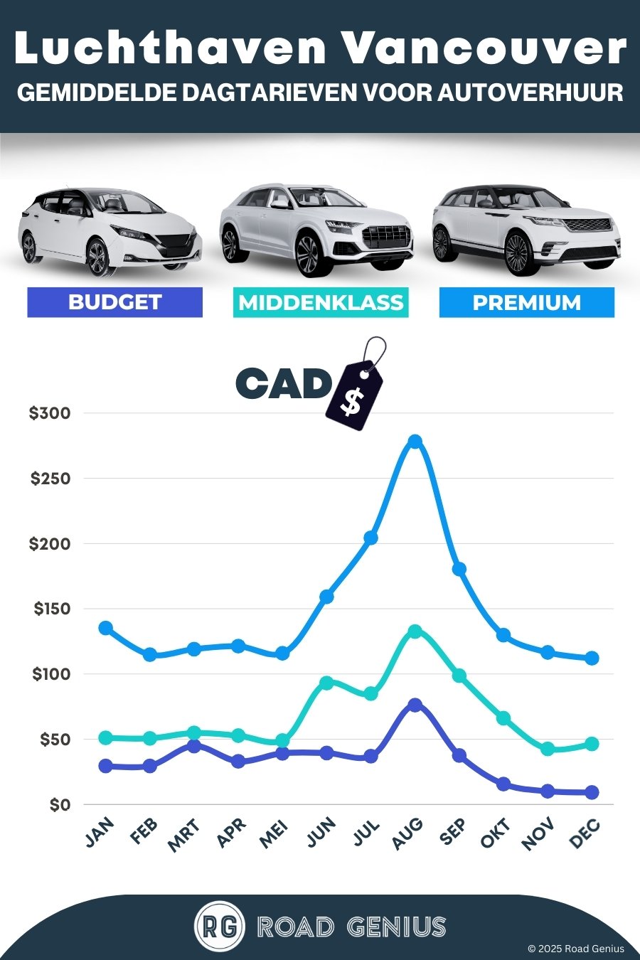 Vergelijk ophalen op de luchthaven met ophalen in het centrum (downtown). Op YVR betaal je meestal een luchthaventoeslag van zo'n 13–17%. De basistarieven in het centrum zijn vaak lager, maar houd rekening met de taxikosten vanaf de luchthaven (ongeveer 35–40 CAD). Voor een week autohuur in de economy-klasse kan de luchthaven zo'n 50–70 CAD duurder zijn. Dit verschil is vergelijkbaar met de kosten van een taxirit.