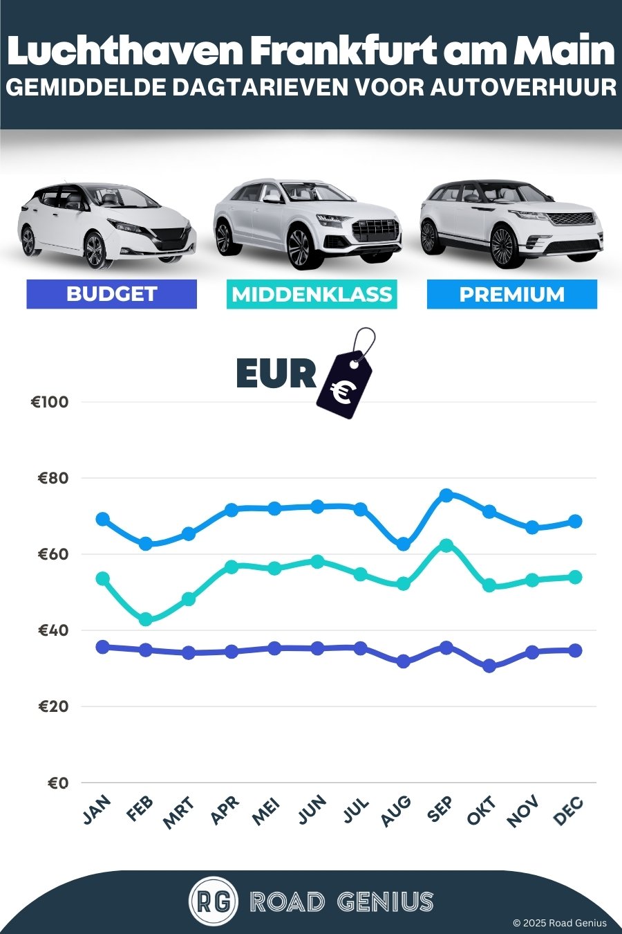 Gemiddeld kost autohuur op Luchthaven Frankfurt am Main ongeveer €52 per dag, met de goedkoopste huurauto’s vanaf €31 per dag.