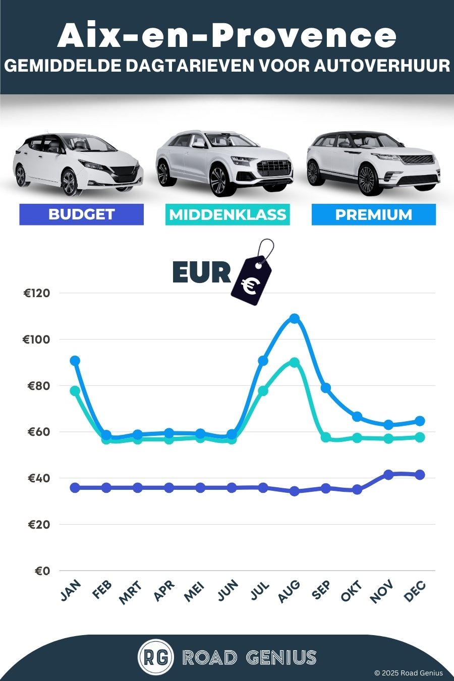 Gemiddeld kost autohuur in Aix-en-Provence ongeveer €57 per dag, met de goedkoopste huurauto’s vanaf €34 per dag.