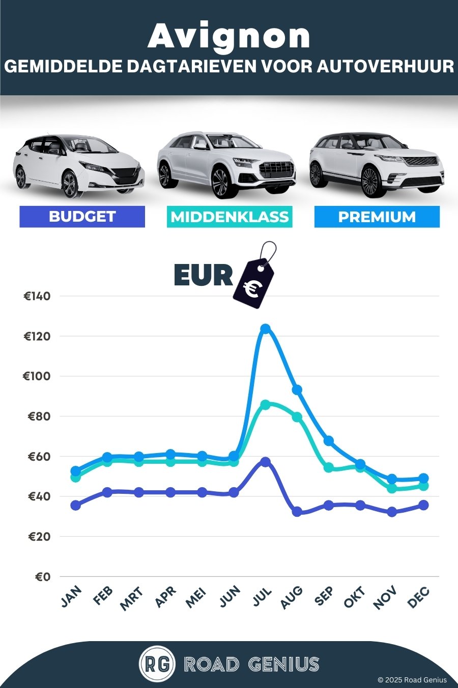 Gemiddeld kost autohuur in Avignon ongeveer €55 per dag, met de goedkoopste huurauto’s vanaf €32 per dag.