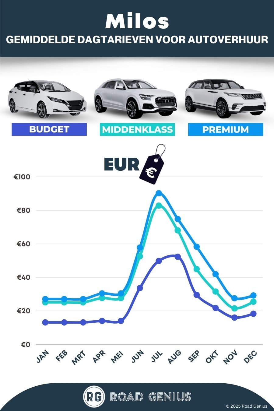 Gemiddeld kost autohuur in Milos ongeveer €35 per dag, met de goedkoopste huurauto’s vanaf €13 per dag.