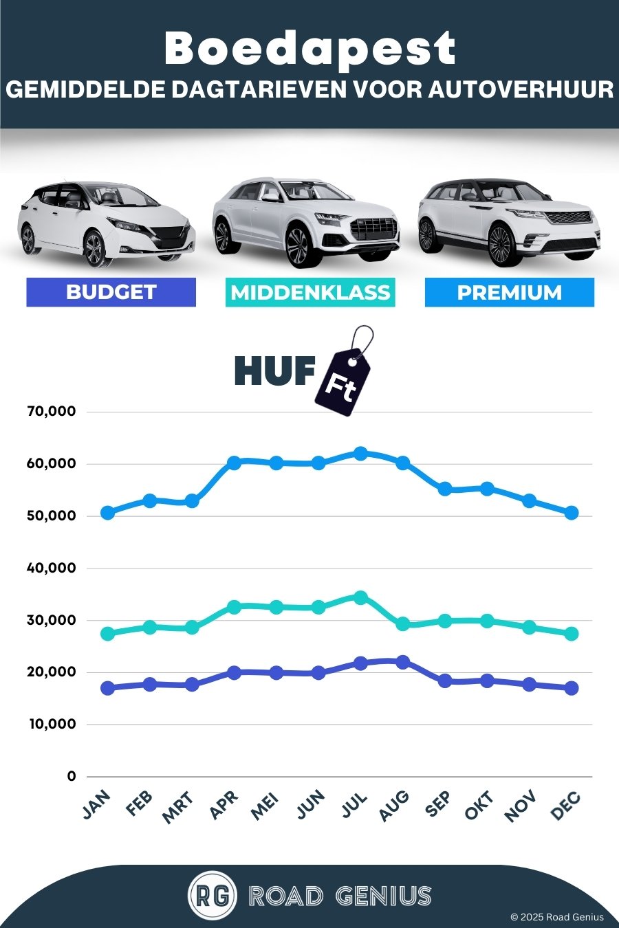 Gemiddeld kost autohuur in Boedapest ongeveer 35.103 HUF per dag, met de goedkoopste huurauto’s vanaf 17.023 HUF per dag.