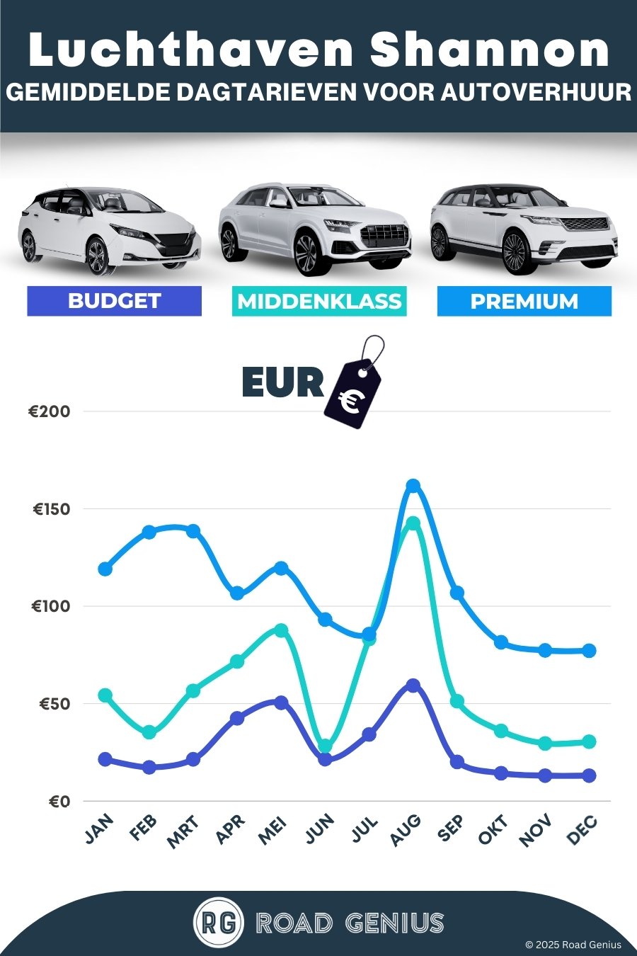 Gemiddeld kost autohuur op Luchthaven Shannon ongeveer €65 per dag, met de goedkoopste huurauto’s vanaf €13 per dag.