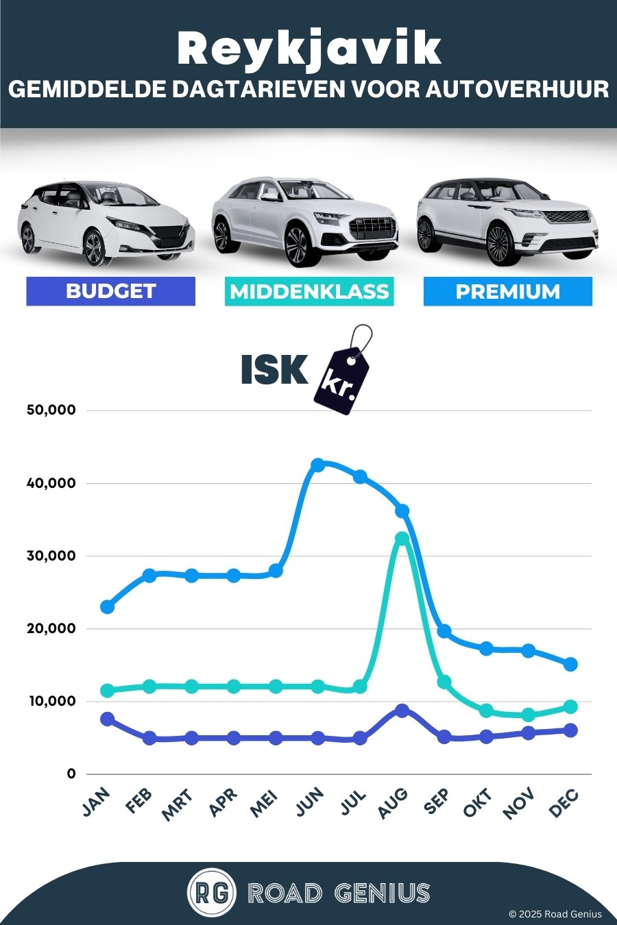 Gemiddeld kost autohuur in Reykjavík ongeveer 15.123 ISK per dag, met de goedkoopste huurauto’s vanaf 4.973 ISK per dag.