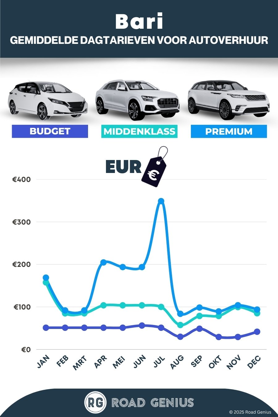 Gemiddeld kost autohuur in Bari ongeveer €96 per dag, met de goedkoopste huurauto’s vanaf €29 per dag.