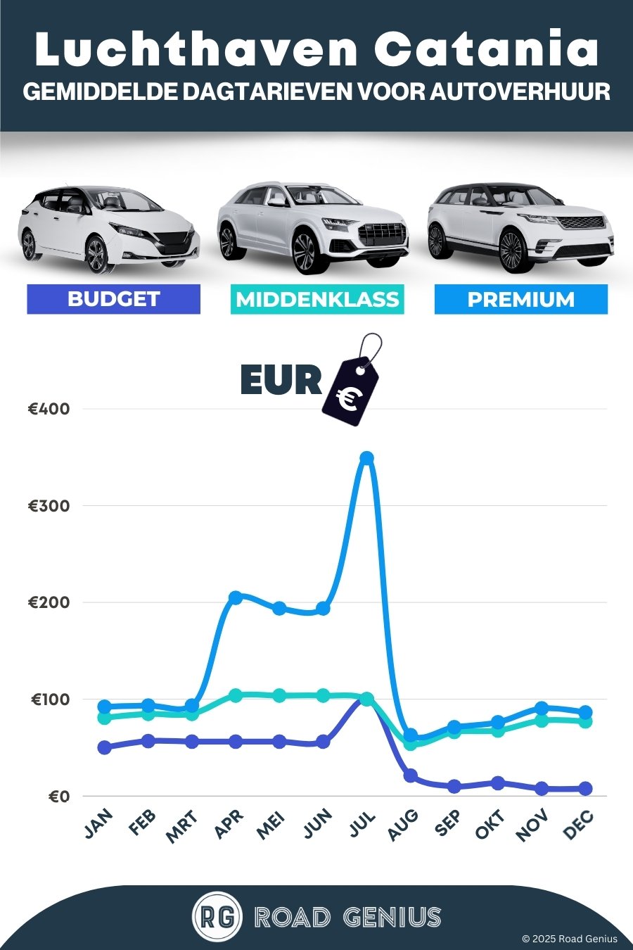 Gemiddeld kost autohuur op Luchthaven Catania ongeveer €86 per dag, met de goedkoopste huurauto’s vanaf €8 per dag.