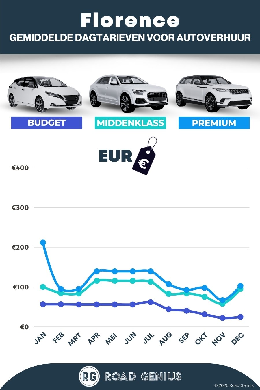 Gemiddeld kost autohuur in Florence ongeveer €87 per dag, met de goedkoopste huurauto’s vanaf €22 per dag.
