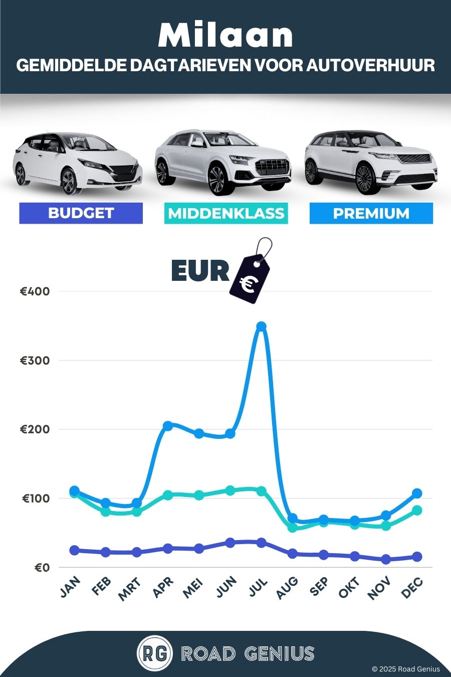Gemiddeld kost autohuur in Milaan ongeveer €81 per dag, met de goedkoopste huurauto’s vanaf €11 per dag.