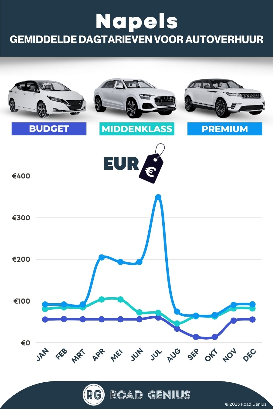 Gemiddeld kost autohuur in Napels ongeveer €86 per dag, met de goedkoopste huurauto’s vanaf €14 per dag.