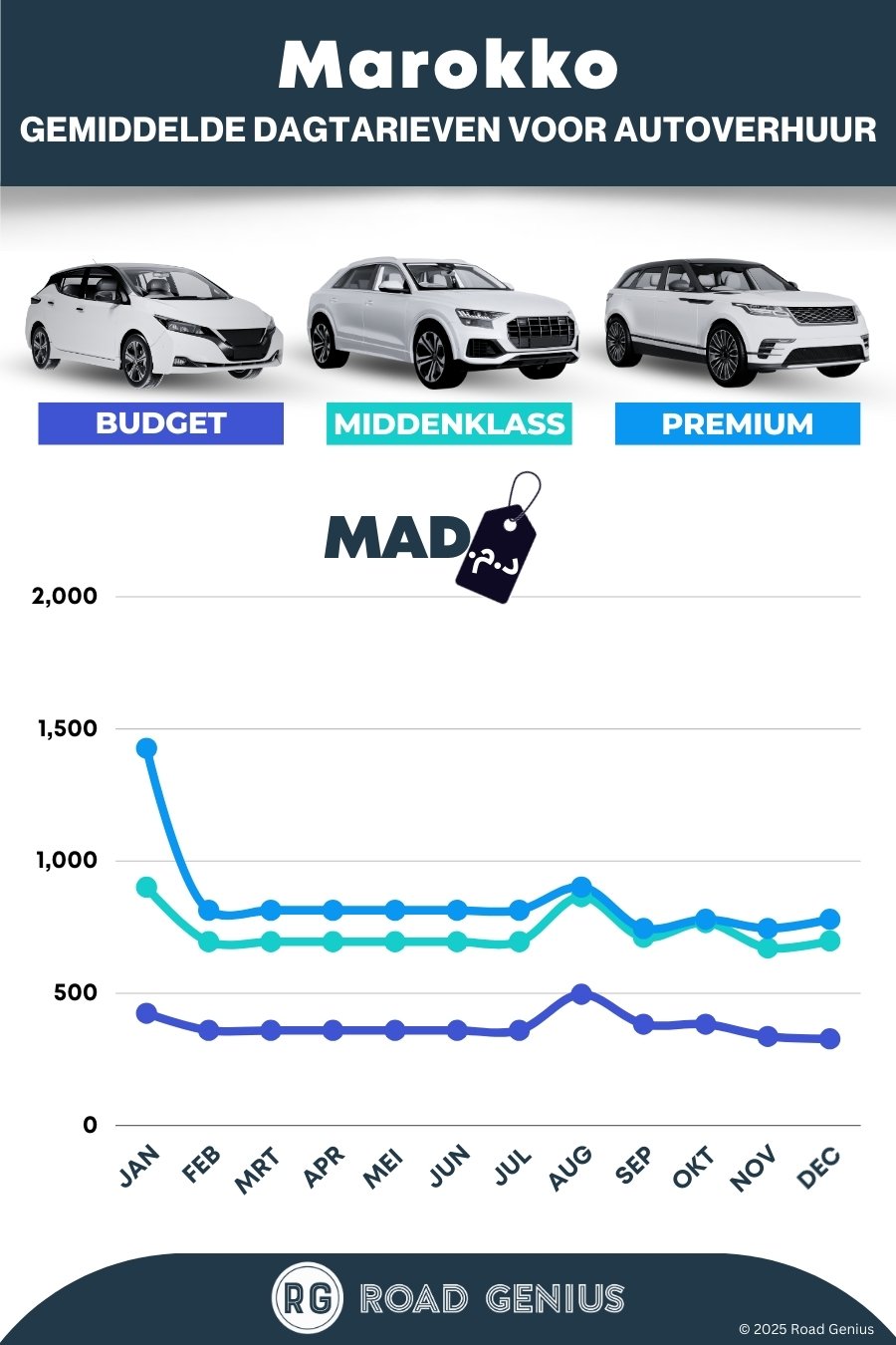 Gemiddeld kost autohuur in Marokko ongeveer MAD 654 per dag, met de goedkoopste huurauto’s vanaf MAD 328 per dag.