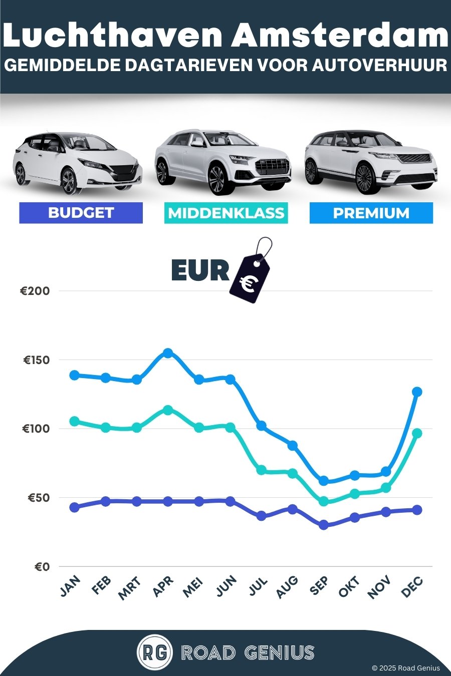 Gemiddeld kost autohuur op Luchthaven Amsterdam ongeveer €80 per dag, met de goedkoopste huurauto’s vanaf €30 per dag.