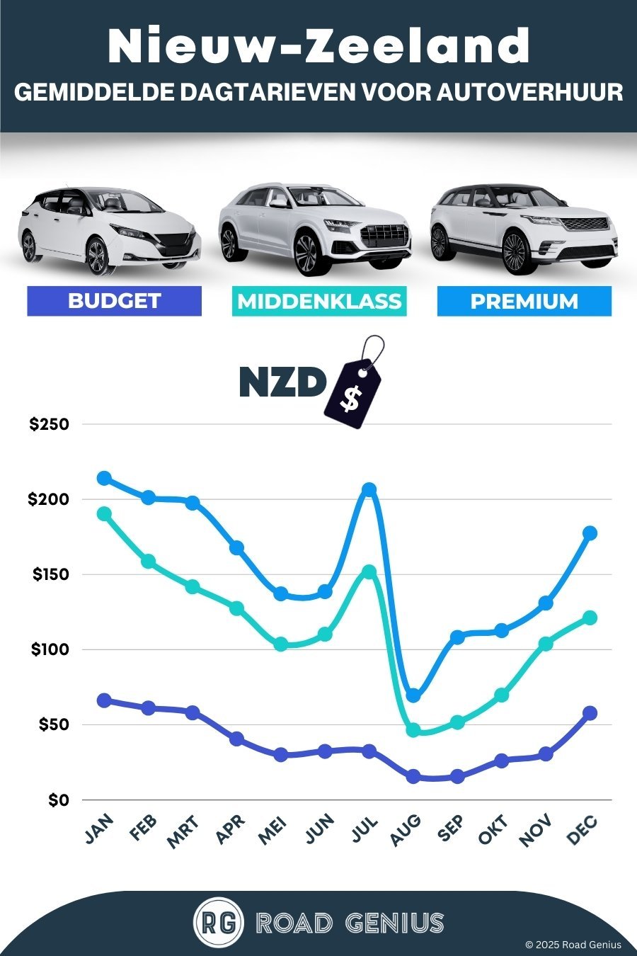 Gemiddeld kost autohuur in Nieuw-Zeeland ongeveer NZ$ 103 per dag, met de goedkoopste huurauto’s vanaf NZ$ 16 per dag.