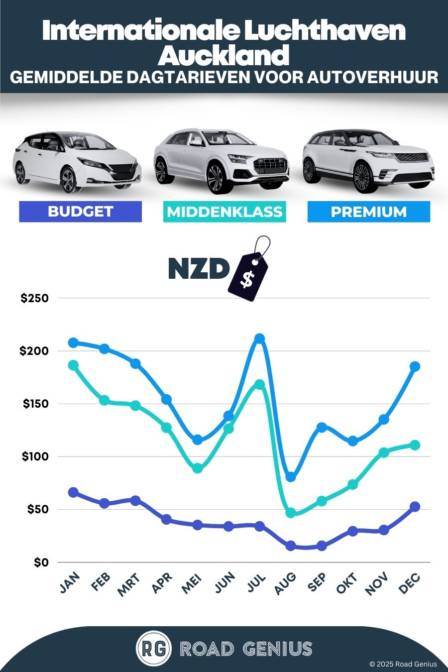 Gemiddeld kost autohuur op Luchthaven Auckland (Internationaal) ongeveer NZ$ 103 per dag, met de goedkoopste huurauto’s vanaf NZ$ 16 per dag.