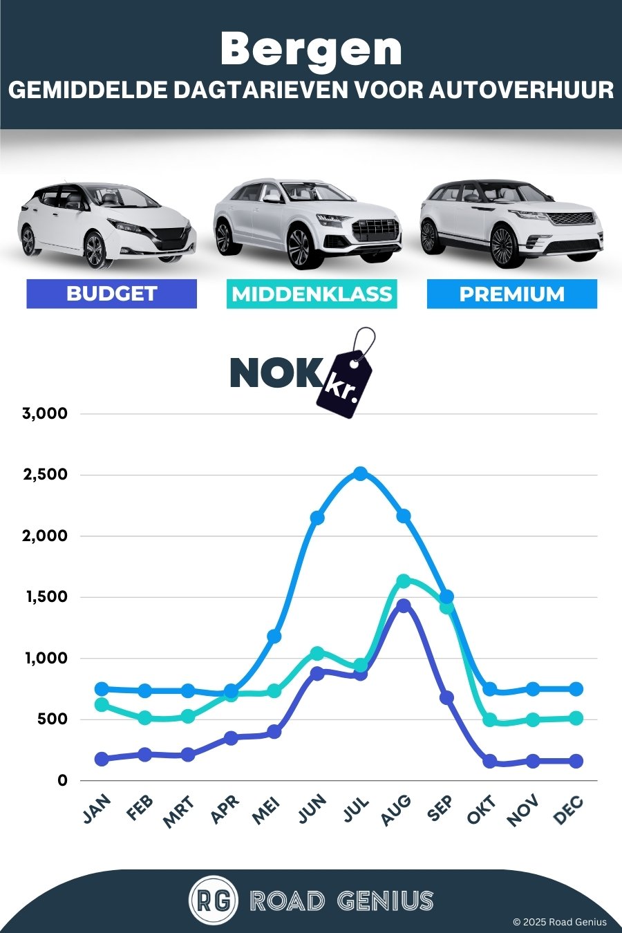 Gemiddeld kost autohuur in Bergen ongeveer 835 kr per dag, met de goedkoopste huurauto’s vanaf 160 kr per dag.