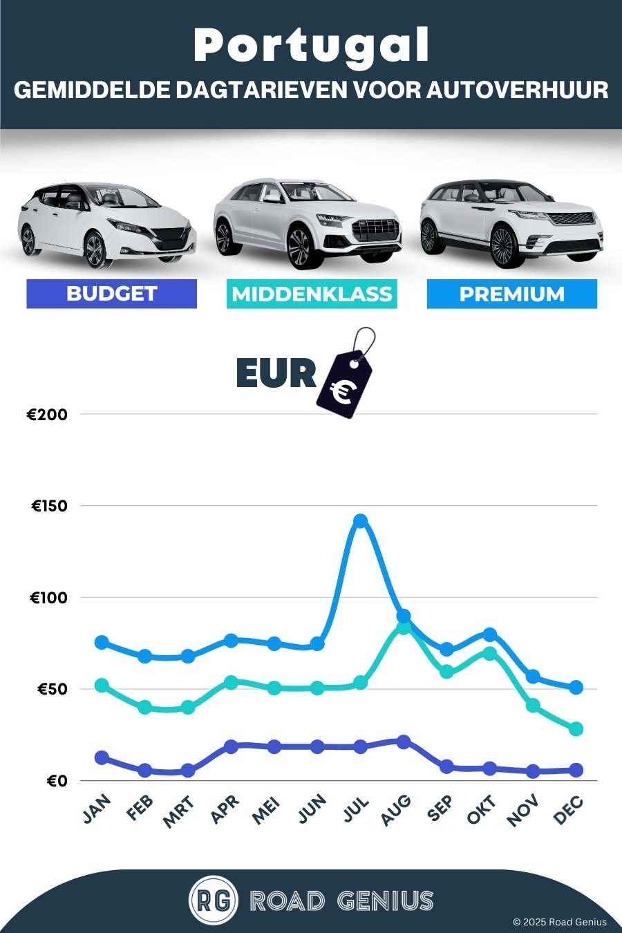 Gemiddeld kost autohuur in Portugal ongeveer €47 per dag, met de goedkoopste huurauto’s vanaf €5 per dag.