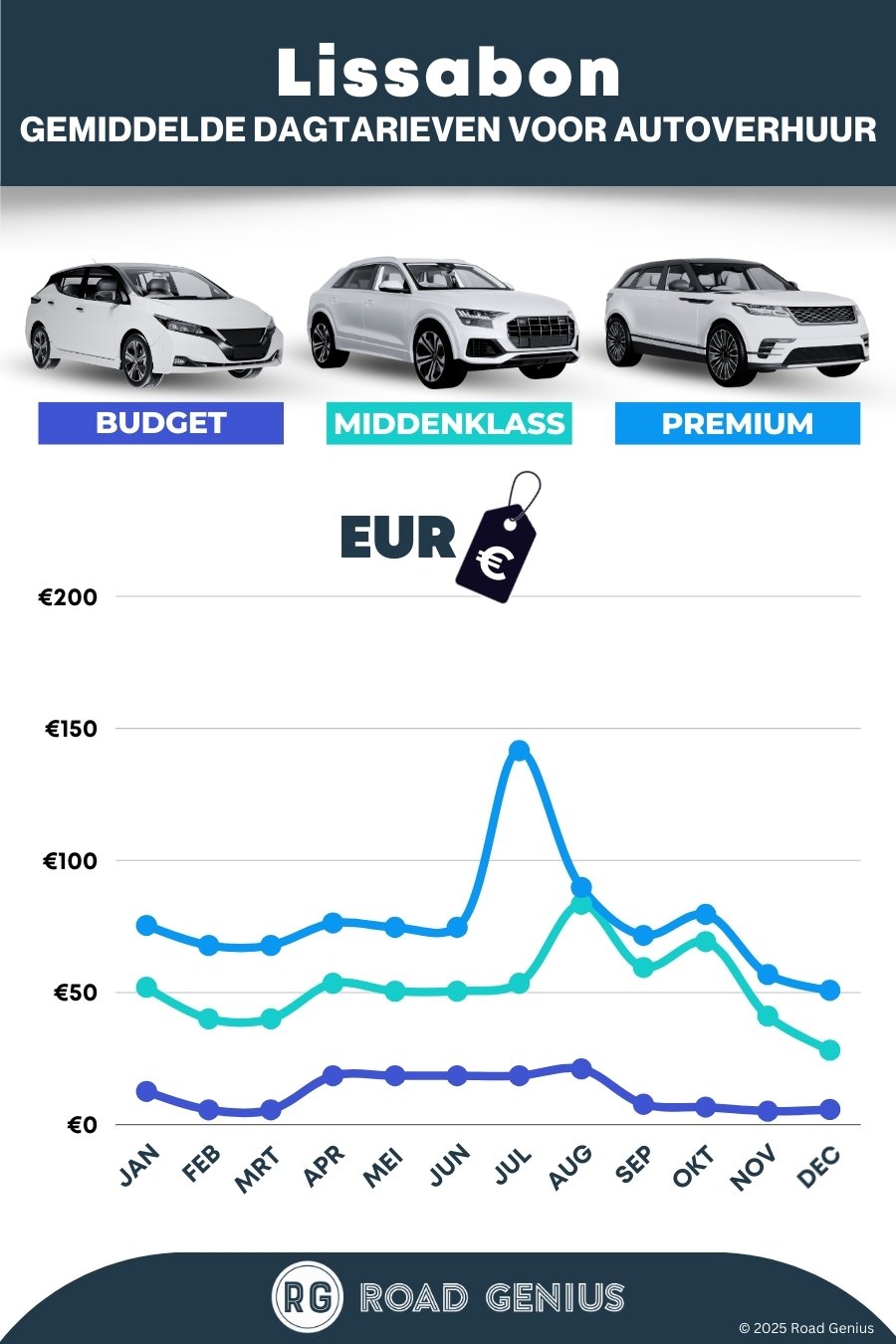 Gemiddeld kost autohuur in Lissabon ongeveer €47 per dag, met de goedkoopste huurauto’s vanaf €5 per dag.