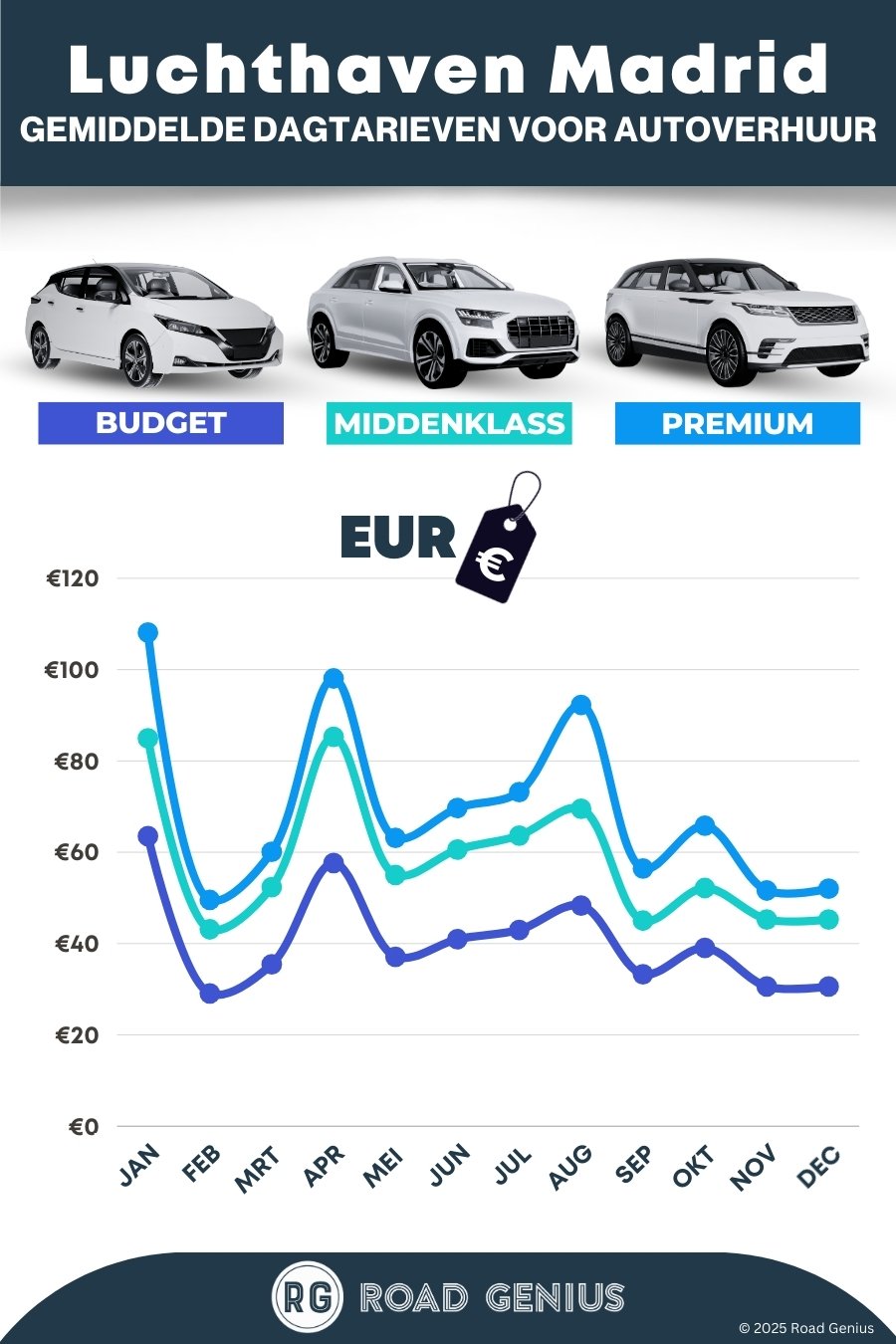 Gemiddeld kost autohuur op Luchthaven Madrid ongeveer €56 per dag, met de goedkoopste huurauto’s vanaf €29 per dag.
