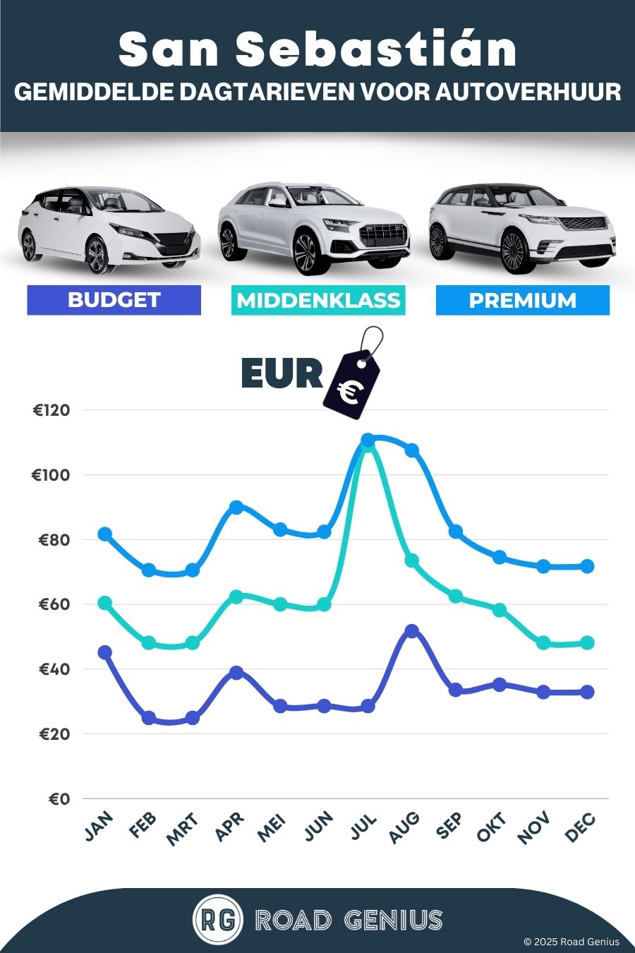 Gemiddeld kost autohuur in San Sebastián ongeveer €59 per dag, met de goedkoopste huurauto’s vanaf €25 per dag.