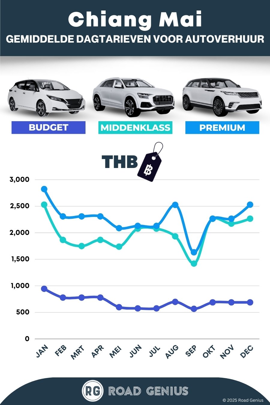 Gemiddeld kost autohuur in Chiang Mai ongeveer THB 1.656 per dag, met de goedkoopste huurauto’s vanaf THB 566 per dag.