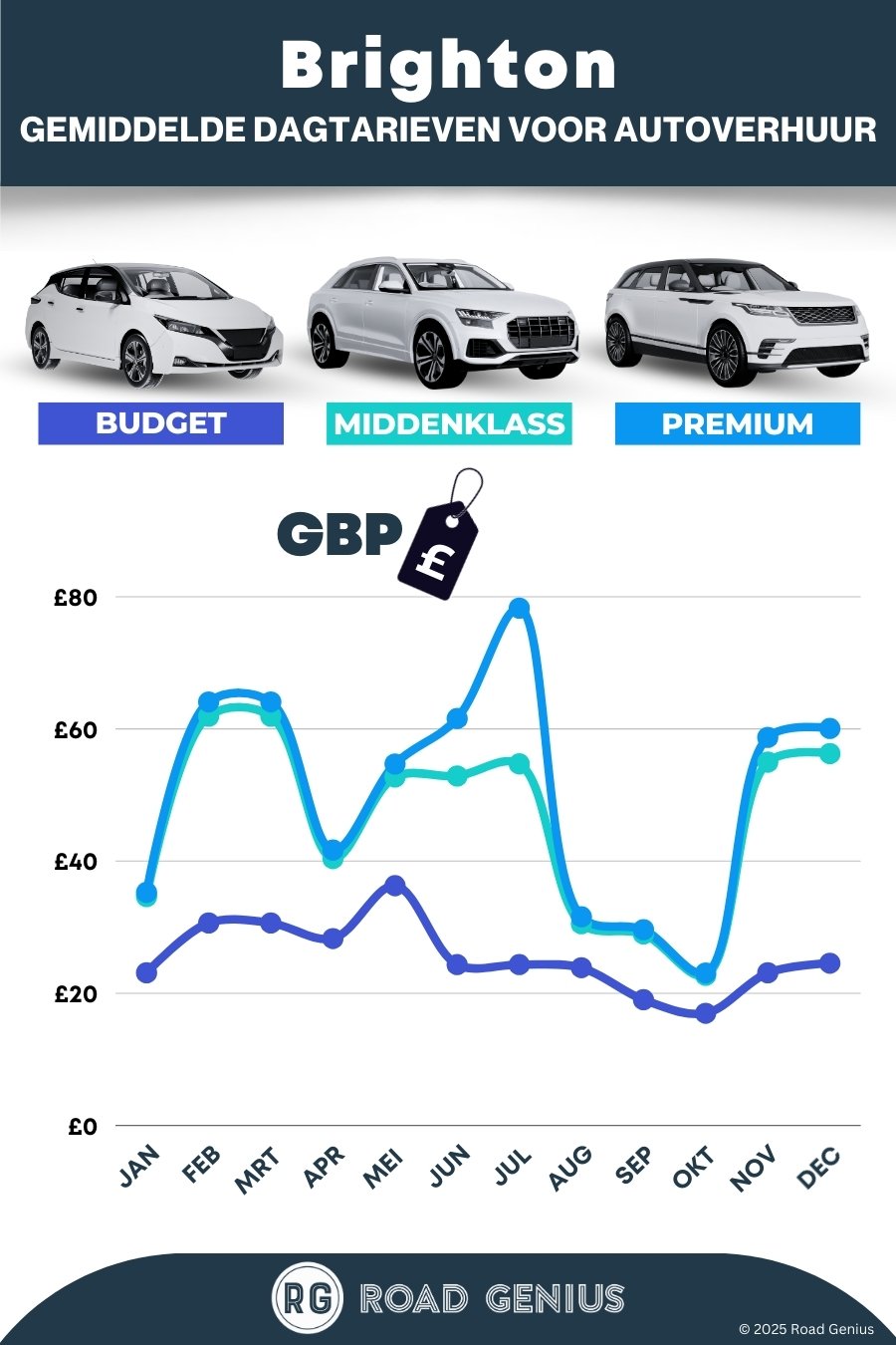 Gemiddeld kost autohuur in Brighton ongeveer €41 per dag, met de goedkoopste huurauto’s vanaf €17 per dag.
