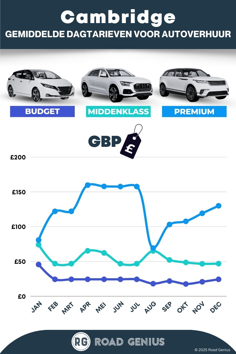 Gemiddeld kost autohuur in Cambridge ongeveer €67 per dag, met de goedkoopste huurauto’s vanaf €18 per dag.