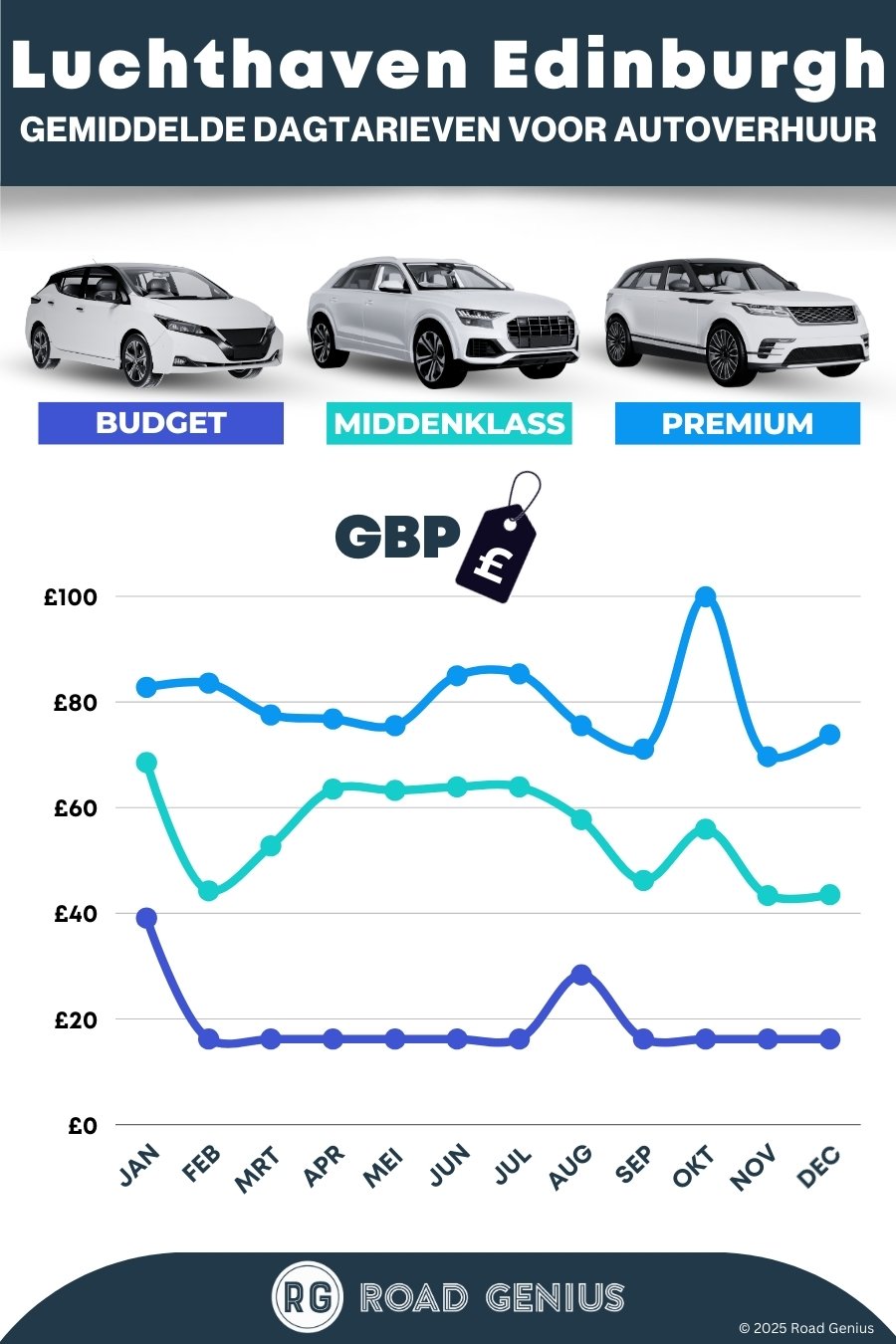 Buiten het hoogseizoen is 2–4 weken van tevoren meestal voldoende. Voor de zomer (juni–augustus) raden we aan om 2–3 maanden vooraf te boeken. Voor het Edinburgh Festival in augustus kun je het beste minimaal 3–4 maanden van tevoren reserveren, omdat auto's dan snel uitverkocht zijn en de prijzen flink stijgen.