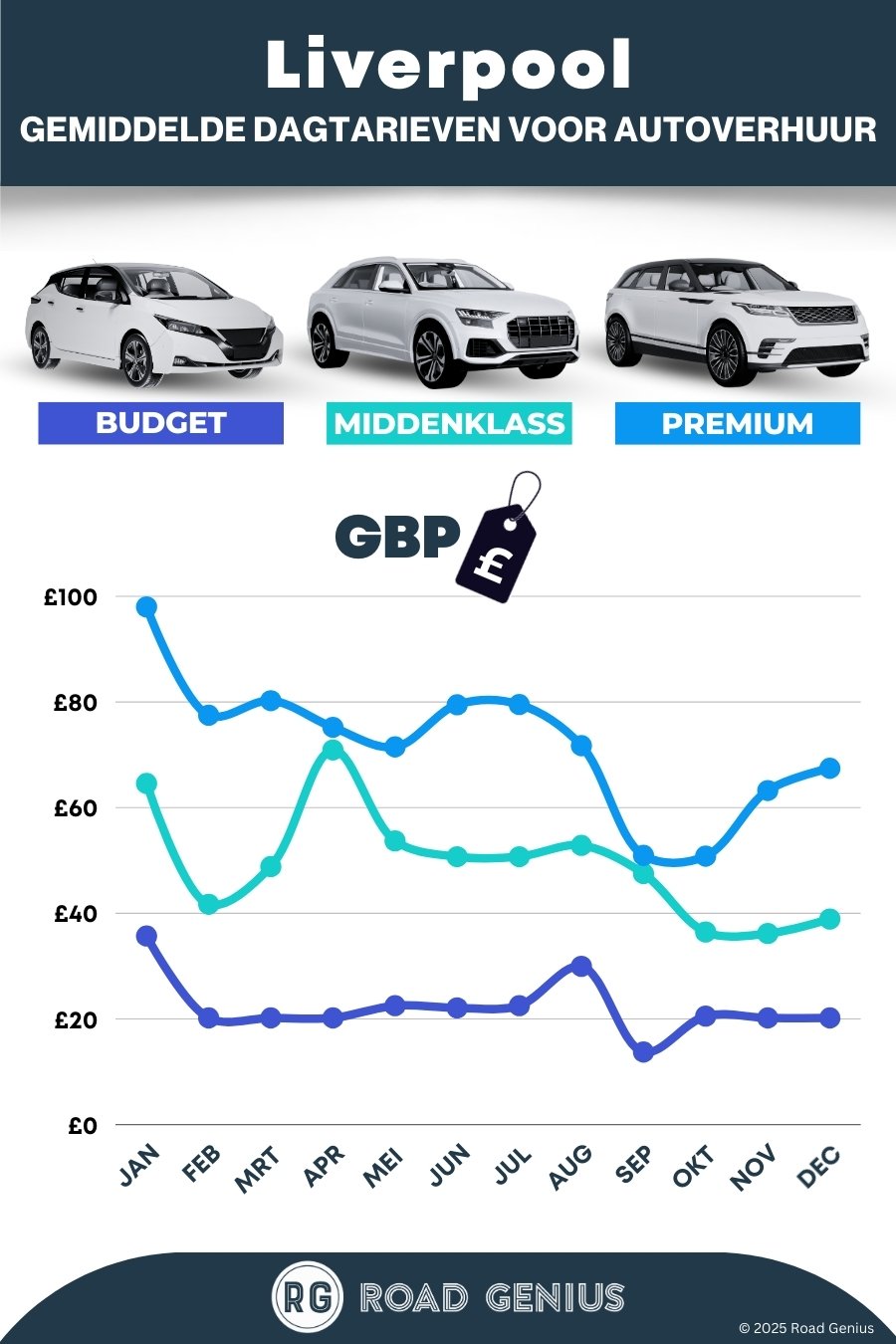 Gemiddeld kost autohuur in Liverpool ongeveer €48 per dag, met de goedkoopste huurauto’s vanaf €14 per dag.