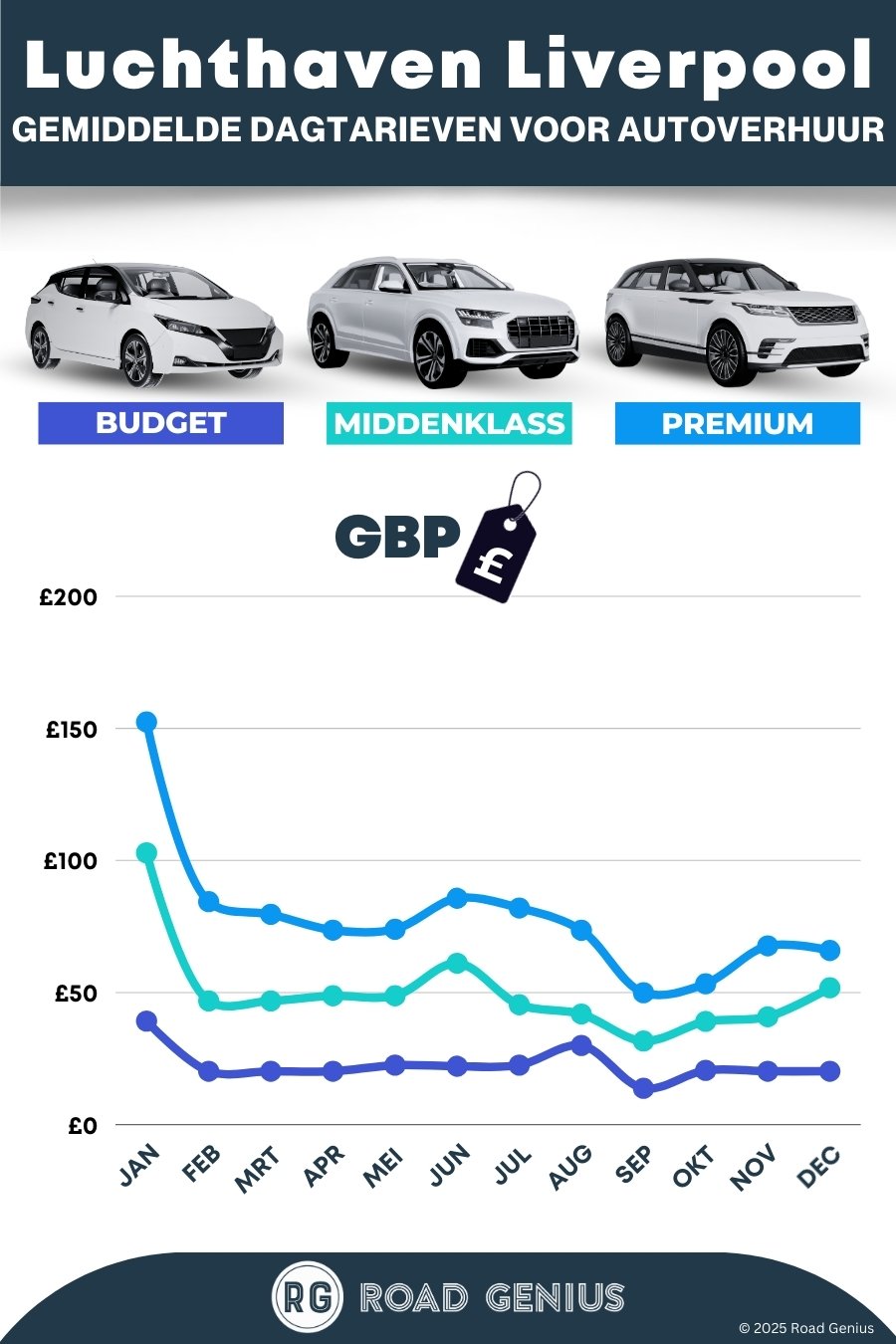 Gemiddeld kost autohuur op Luchthaven Liverpool ongeveer €51 per dag, met de goedkoopste huurauto’s vanaf €14 per dag.
