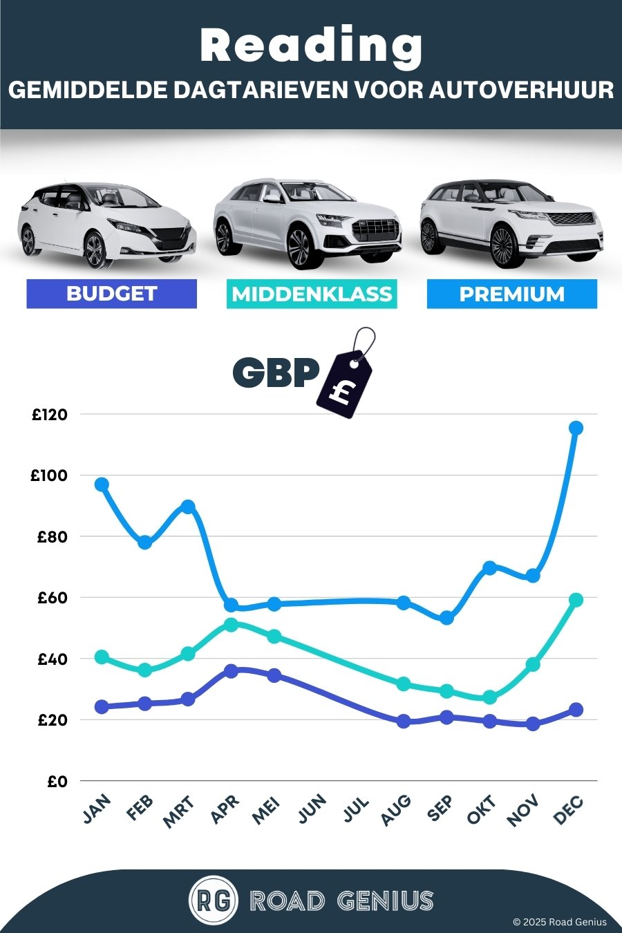 Gemiddeld kost autohuur in Reading ongeveer £46 per dag, met de goedkoopste huurauto’s vanaf £19 per dag.