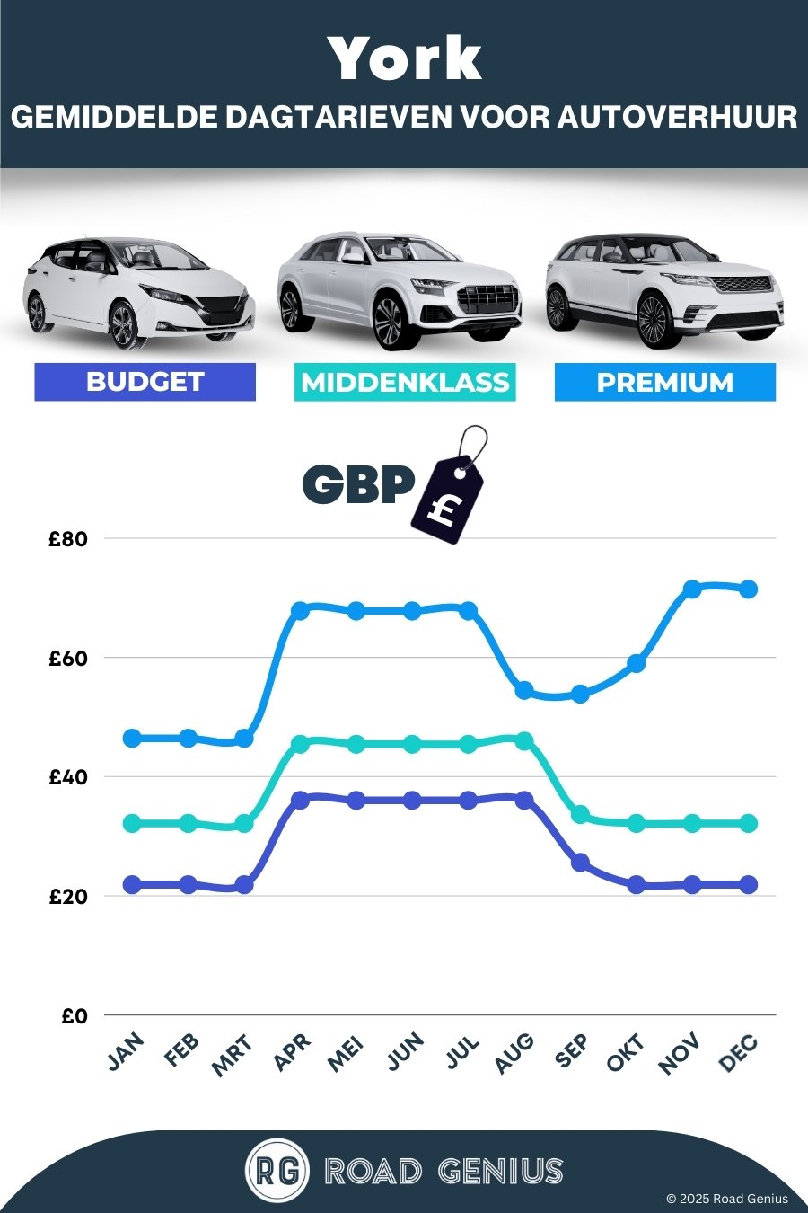 Gemiddeld kost autohuur in York ongeveer €42 per dag, met de goedkoopste huurauto’s vanaf €22 per dag.