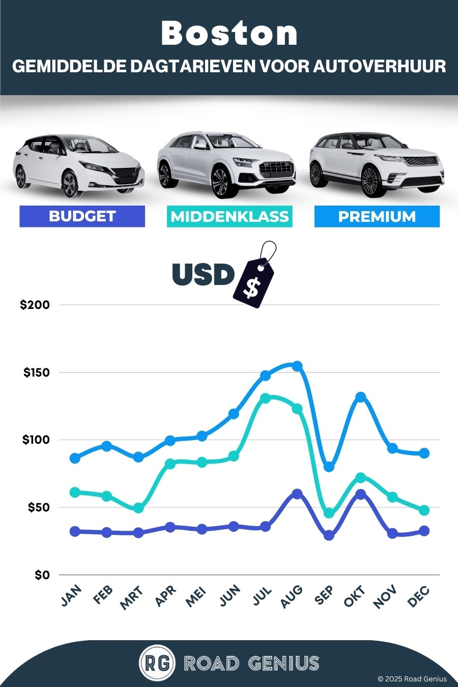 Gemiddeld kost autohuur in Boston ongeveer US$ 73 per dag, met de goedkoopste huurauto’s vanaf US$ 29 per dag.