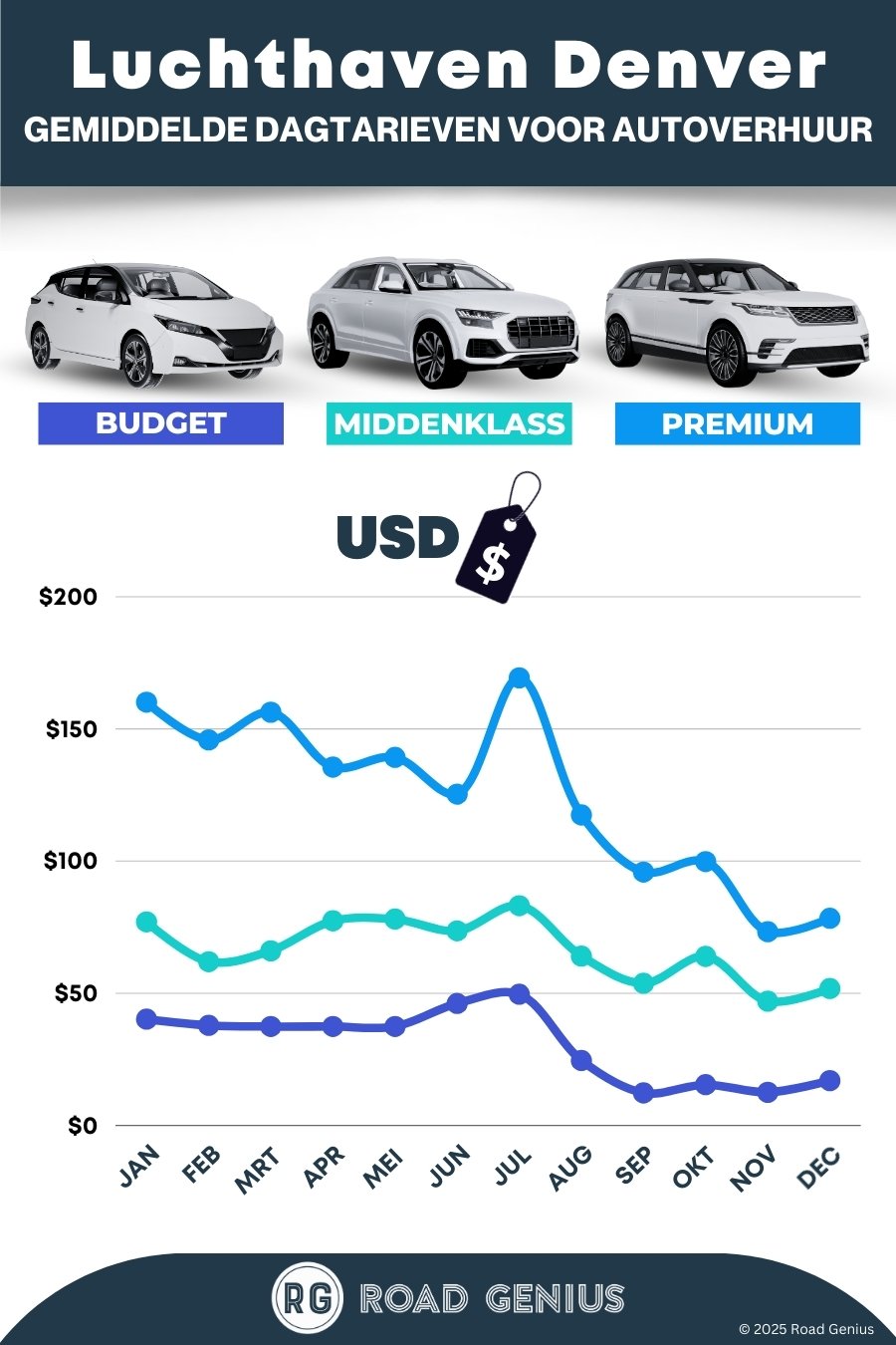 Gemiddeld kost autohuur op Luchthaven Denver ongeveer US$ 74 per dag, met de goedkoopste huurauto’s vanaf US$ 12 per dag.