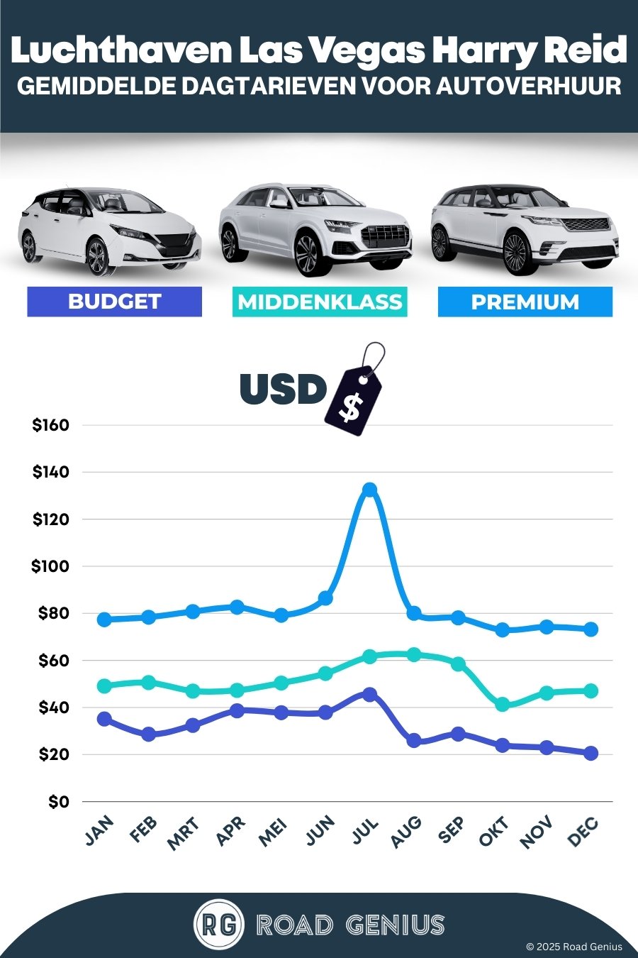 Gemiddeld kost autohuur op Luchthaven Las Vegas Harry Reid ongeveer US$ 55 per dag, met de goedkoopste huurauto’s vanaf US$ 21 per dag.