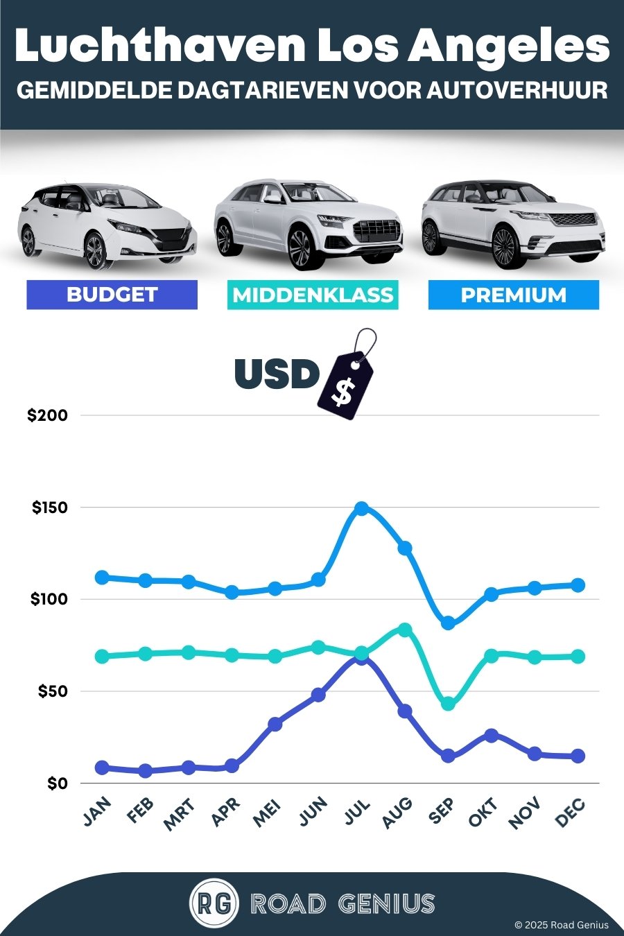 Wees flexibel met je huurdata en kijk ook naar weektarieven. Vooral in de zomer en tijdens vakanties geldt op LAX: als je 2 tot 4 weken van tevoren boekt, betaal je vaak minder.
