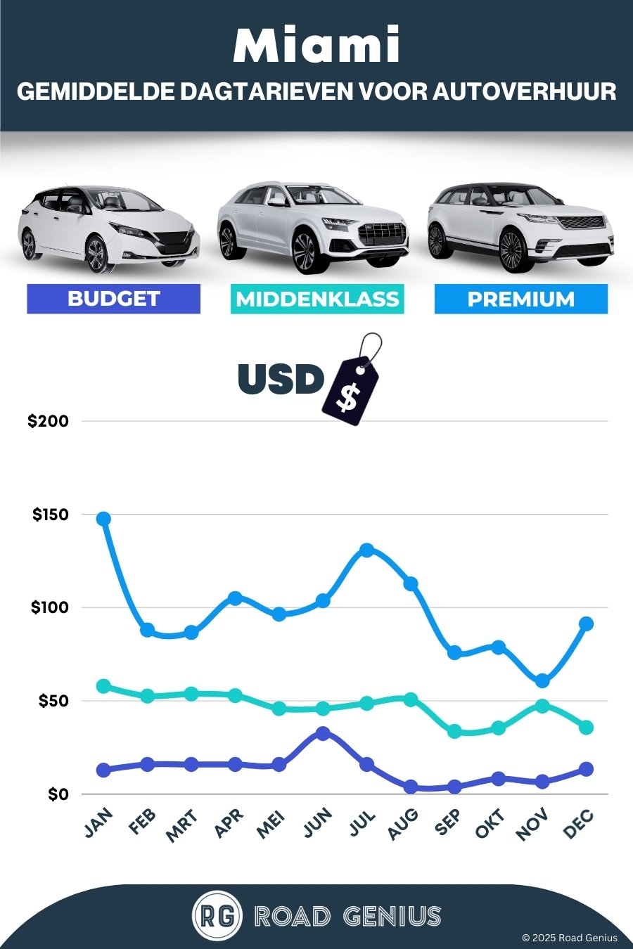 Gemiddeld kost autohuur in Miami ongeveer US$ 53 per dag, met de goedkoopste huurauto’s vanaf US$ 4 per dag.
