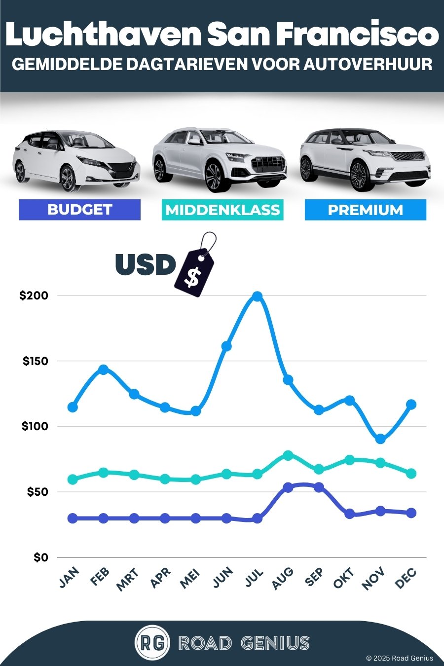 Gemiddeld kost autohuur op Luchthaven San Francisco ongeveer US$ 76 per dag, met de goedkoopste huurauto’s vanaf US$ 30 per dag.
