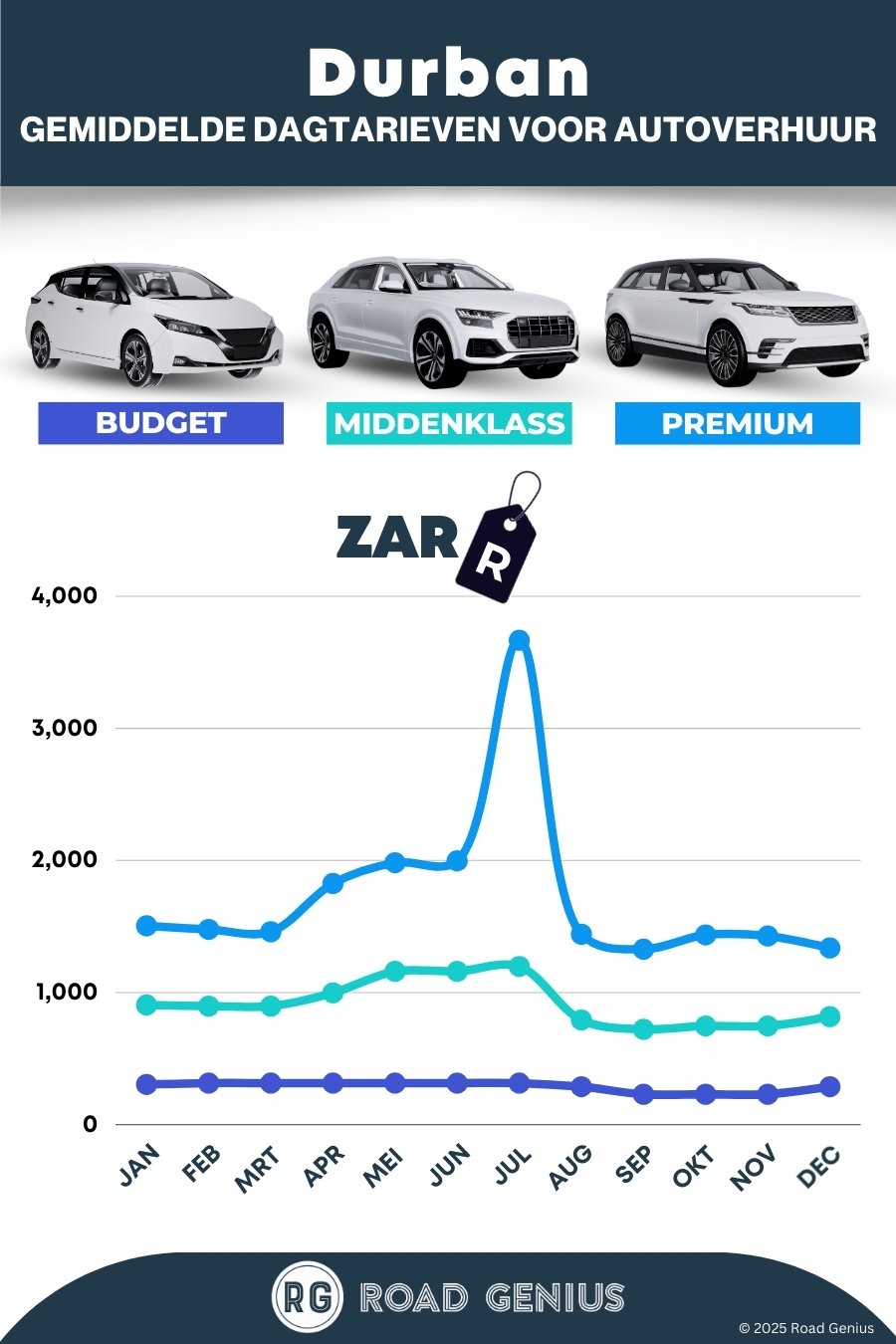 Wees flexibel met data: In Durban is ophalen op woensdag vaak goedkoper en augustus is meestal de voordeligste maand. Voor de drukke periodes in december en rond Pasen kun je het beste 3–6 maanden van tevoren boeken. Buiten het hoogseizoen loont het om de prijzen even te volgen voordat je boekt.