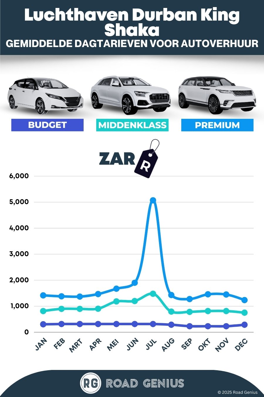 Gemiddeld kost autohuur op Luchthaven Durban King Shaka ongeveer ZAR 997 per dag, met de goedkoopste huurauto’s vanaf ZAR 230 per dag.