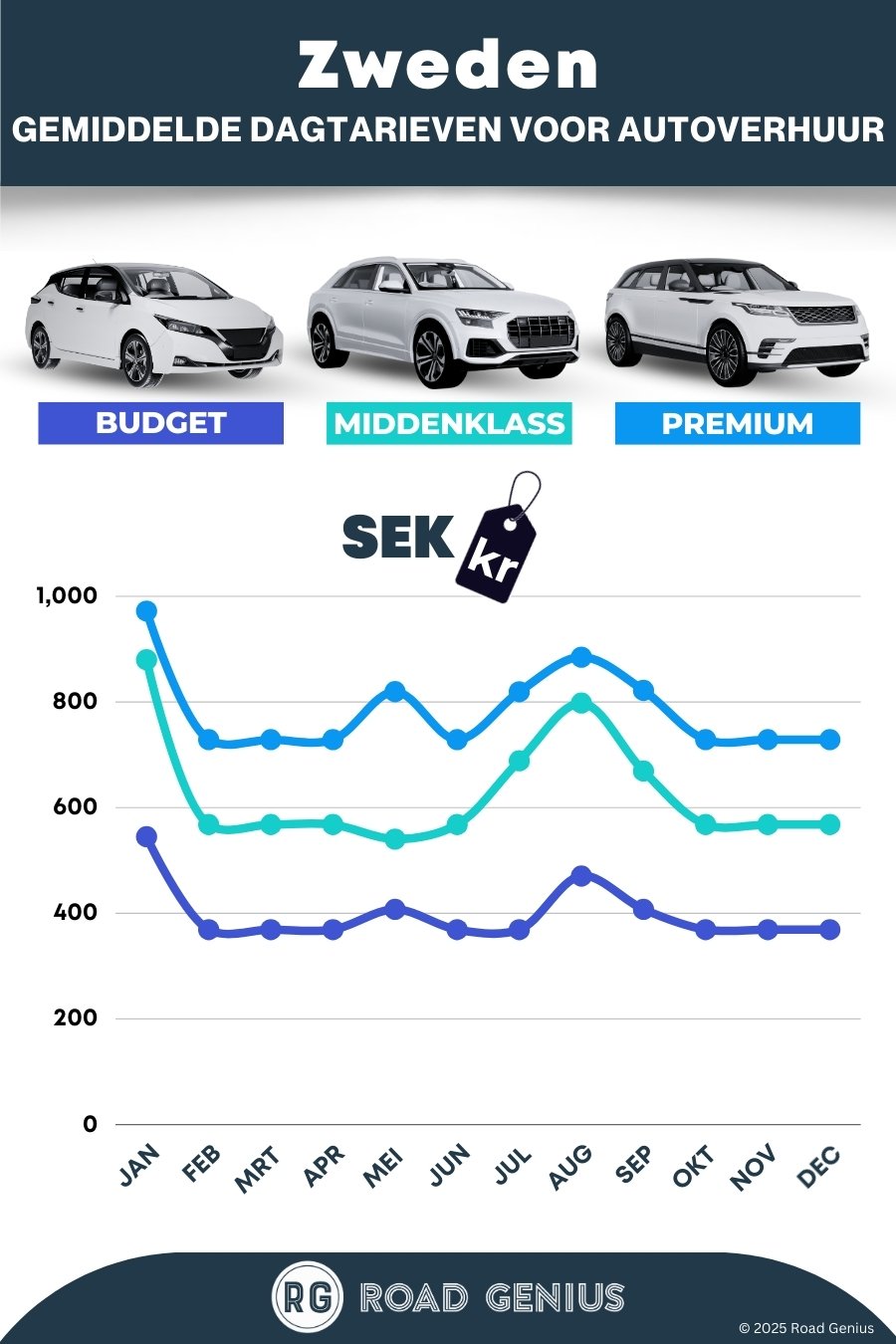 Gemiddeld kost autohuur in Zweden ongeveer 604 kr per dag, met de goedkoopste huurauto’s vanaf 369 kr per dag.