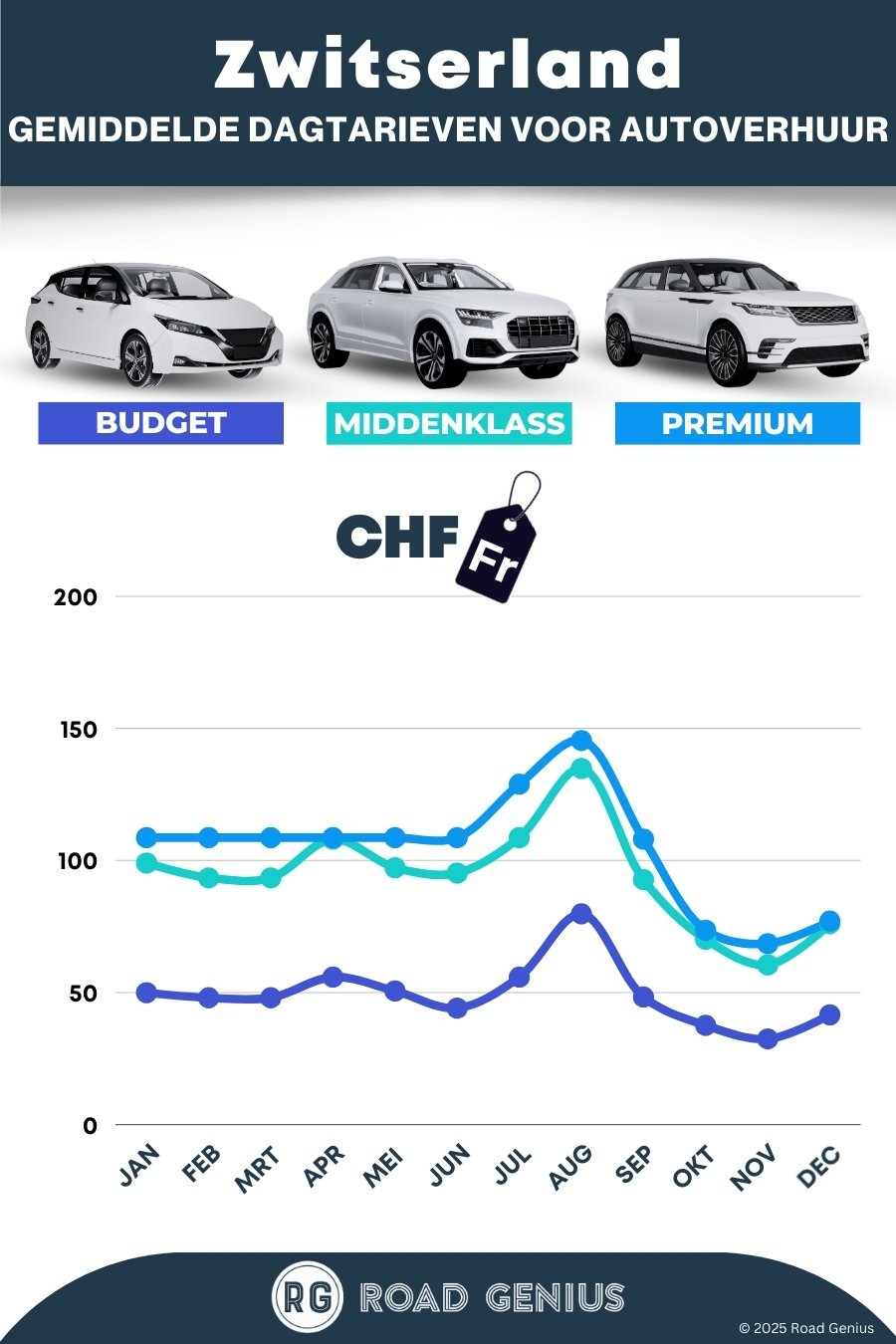Gemiddeld kost autohuur in Zwitserland ongeveer CHF 83 per dag, met de goedkoopste huurauto’s vanaf CHF 32 per dag.