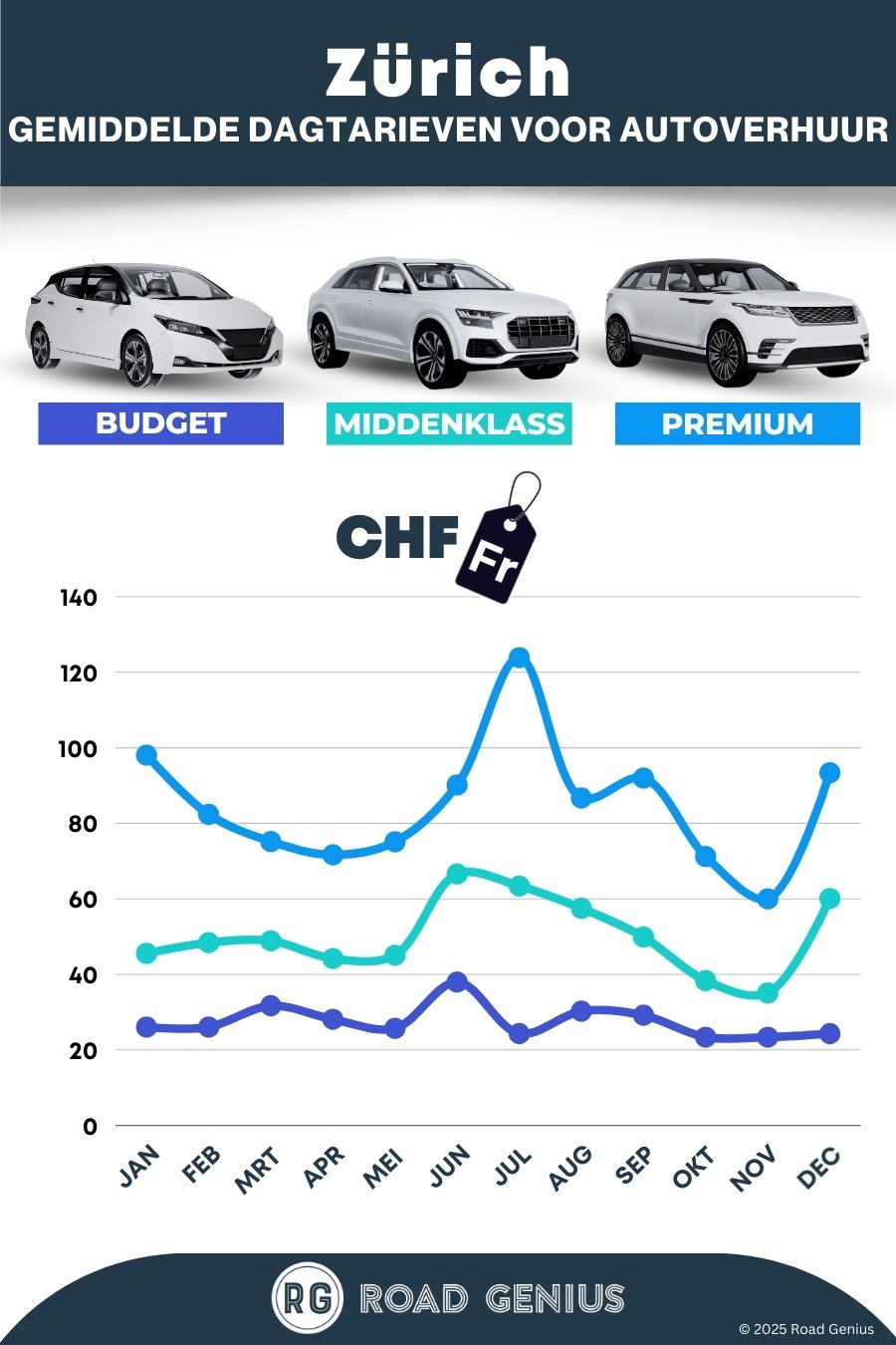 Gemiddeld kost autohuur in Zürich ongeveer CHF 58 per dag, met de goedkoopste huurauto’s vanaf CHF 23 per dag.