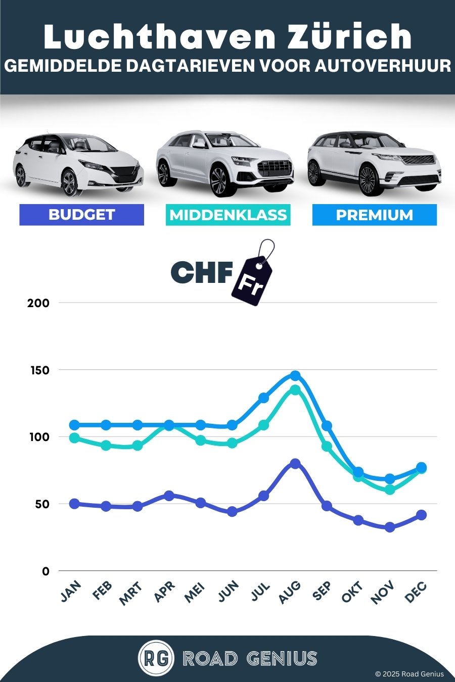 Gemiddeld kost autohuur op Luchthaven Zürich ongeveer CHF 76 per dag, met de goedkoopste huurauto’s vanaf CHF 25 per dag.