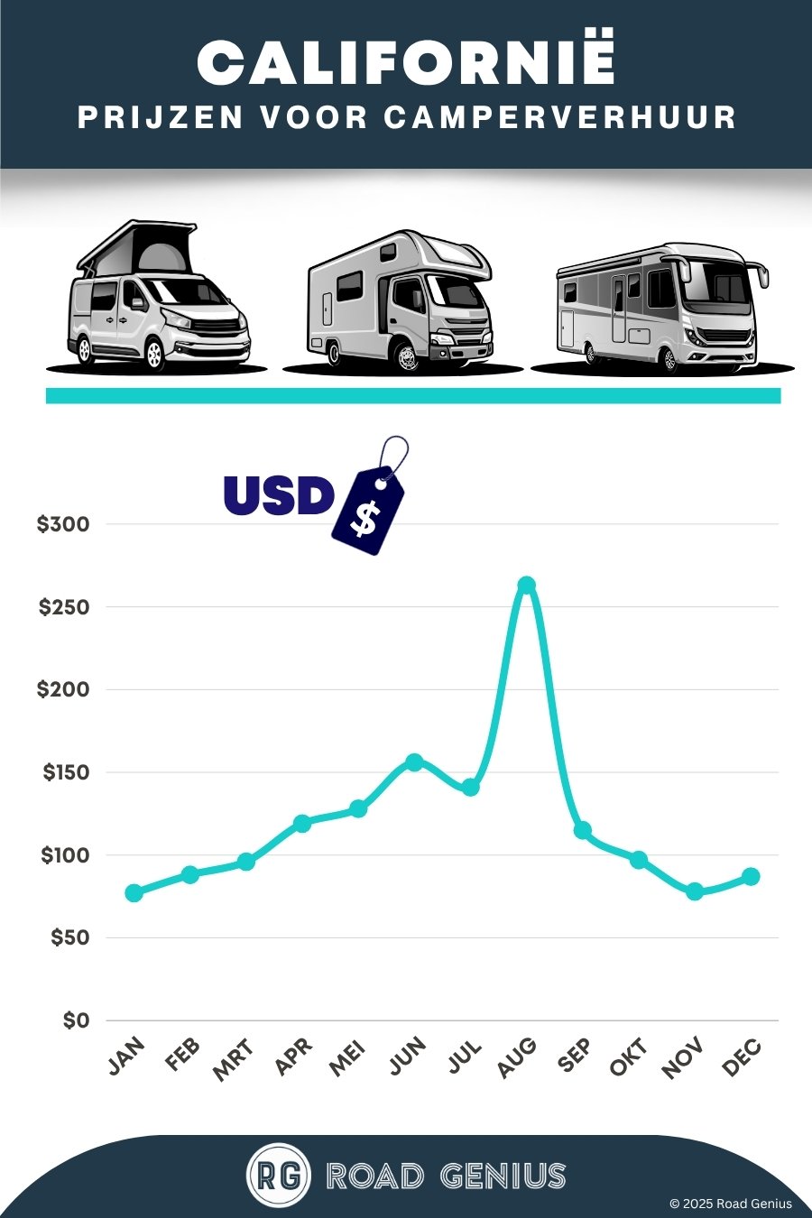 De kosten voor het huren van een camper in Californië hangen af van factoren zoals de grootte van de camper, de leeftijd, de voorzieningen, de duur van de boeking, het seizoen en de ophaal-/inleverlocaties.