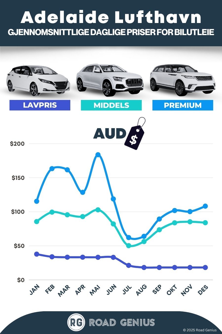 I gjennomsnitt koster leiebil på Adelaide lufthavn (ADL) rundt AUD 100 per dag, og de laveste prisene starter på AUD 18 per dag.