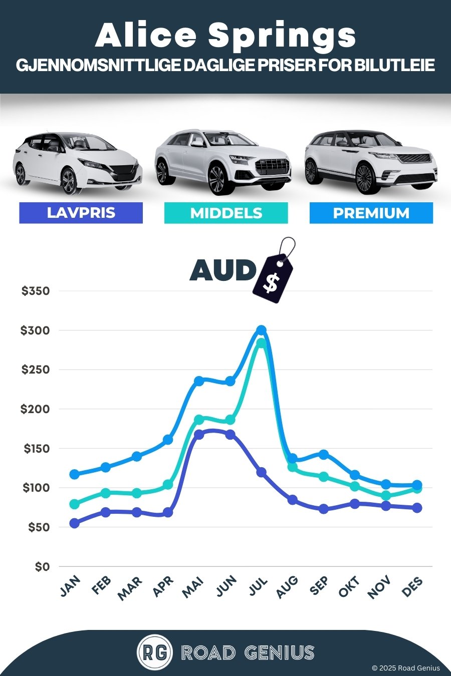 Med Road Genius er det enkelt å finne gode tilbud på leiebil i Alice Springs og resten av Australia. Her kan du sammenligne priser og bestille. Leiebil er nærmest uunnværlig for å oppleve The Red Centre, fra Uluru til West MacDonnell Ranges. Vi hjelper deg med å sammenligne biler og finne et praktisk hentested, enten det er på flyplassen eller i sentrum.