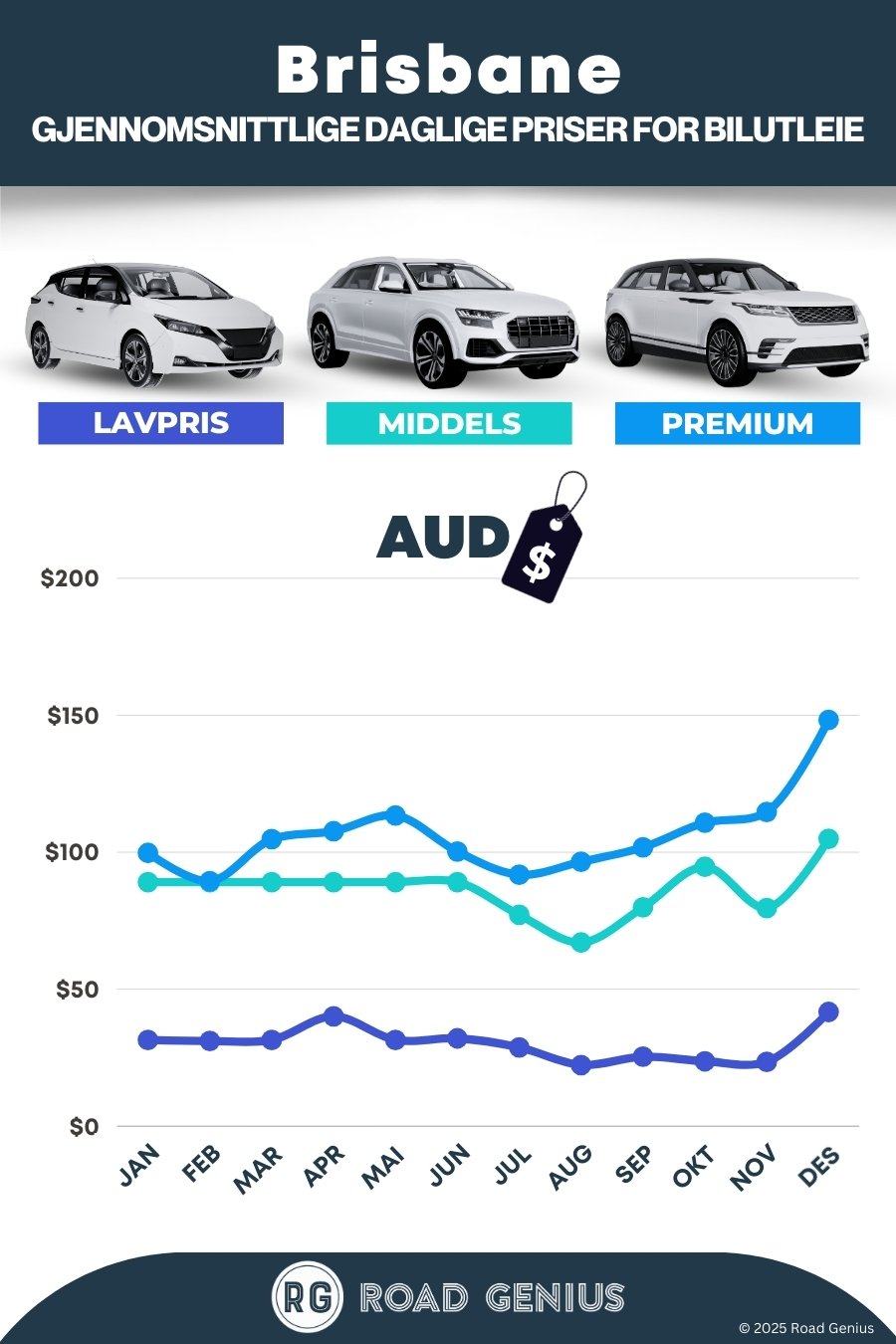 I gjennomsnitt koster leiebil i Brisbane rundt AUD 95 per dag, og de billigste leiebilene er tilgjengelige fra AUD 22 per dag.