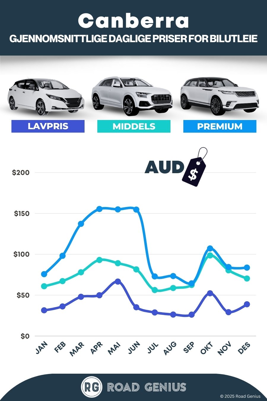 I gjennomsnitt koster leiebil i Canberra rundt AUD 85 per dag, og de billigste leiebilene er tilgjengelige fra AUD 26 per dag.