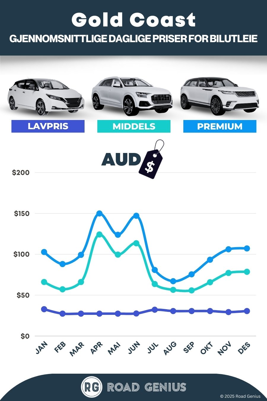 Finn gode priser på leiebil på Gold Coast med Road Genius. Sammenlign oppdaterte priser på SUV-er, stasjonsvogner og minibusser, og bestill helt uten gebyrer. Vi sammenligner leiebiler fra utleiestasjonene på Gold Coast Airport og i områder som Surfers Paradise, slik at du enkelt kan utforske fornøyelsesparker, strender og innlandet i ditt eget tempo.