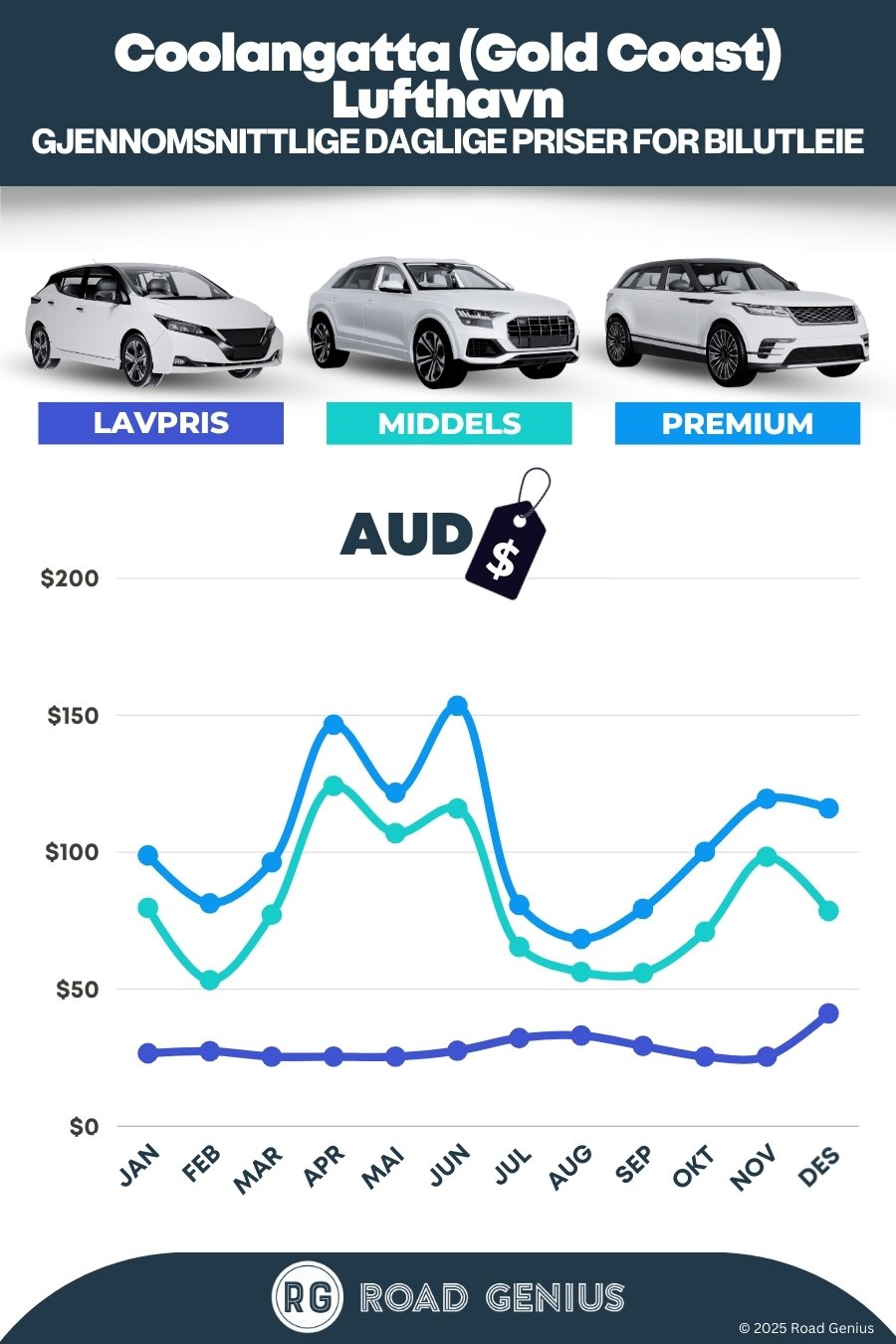 I gjennomsnitt koster leiebil på Gold Coast lufthavn (OOL) rundt AUD 93 per dag, og de laveste prisene starter på AUD 25 per dag.