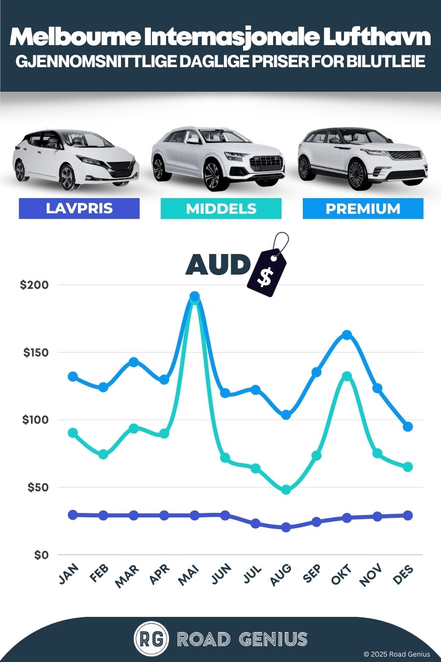 I gjennomsnitt koster leiebil på Melbourne lufthavn (MEL) rundt AUD 111 per dag, og de laveste prisene starter på AUD 20 per dag.